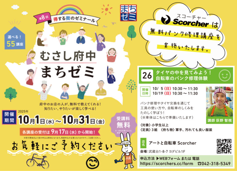第8回むさし府中まちゼミ「タイヤの中を見てみよう!自転車のパンク修理体験」日時:10/5(日)10:30-11:3010/19(日)10:30-11:30※各回、1時間
